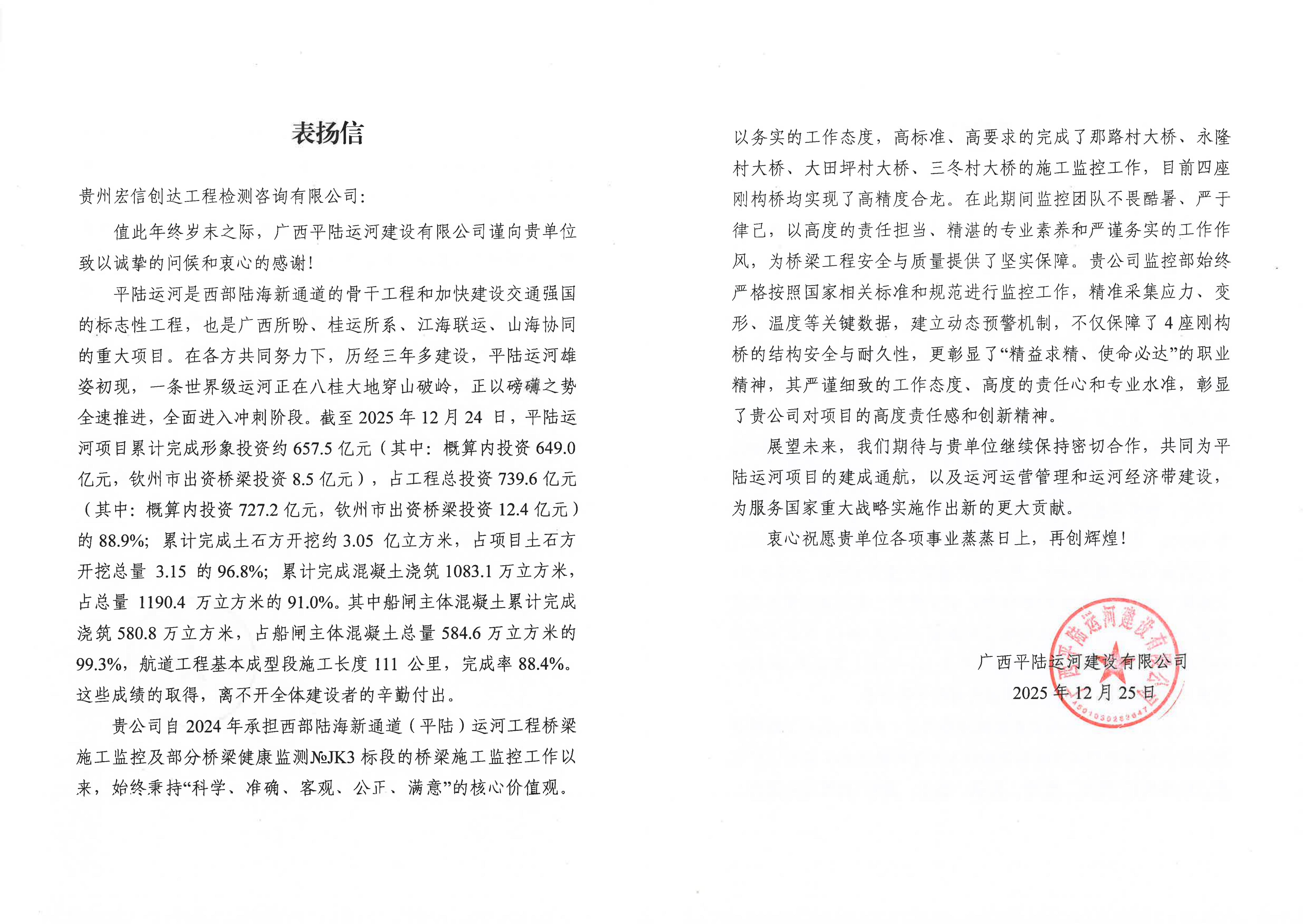 近日,贵州宏信创达工程检测咨询有限公司收到广西平陆运河建设有限公司发来的表扬信,对我公司承担的西部陆海新通道(平陆)运河工程桥梁施工监控及部分桥梁健康监测№JK3标段工作给予高度肯定和赞扬。平陆运河是新中国成立以来建设的第一条大运河,其建设对贯通广西水运通道、服务“一带一路”建设、构建国家综合立体交通网、推动西部大开发以及实现水资源综合利用具有重大战略意义。作为参建单位,我公司自2024年3月成立